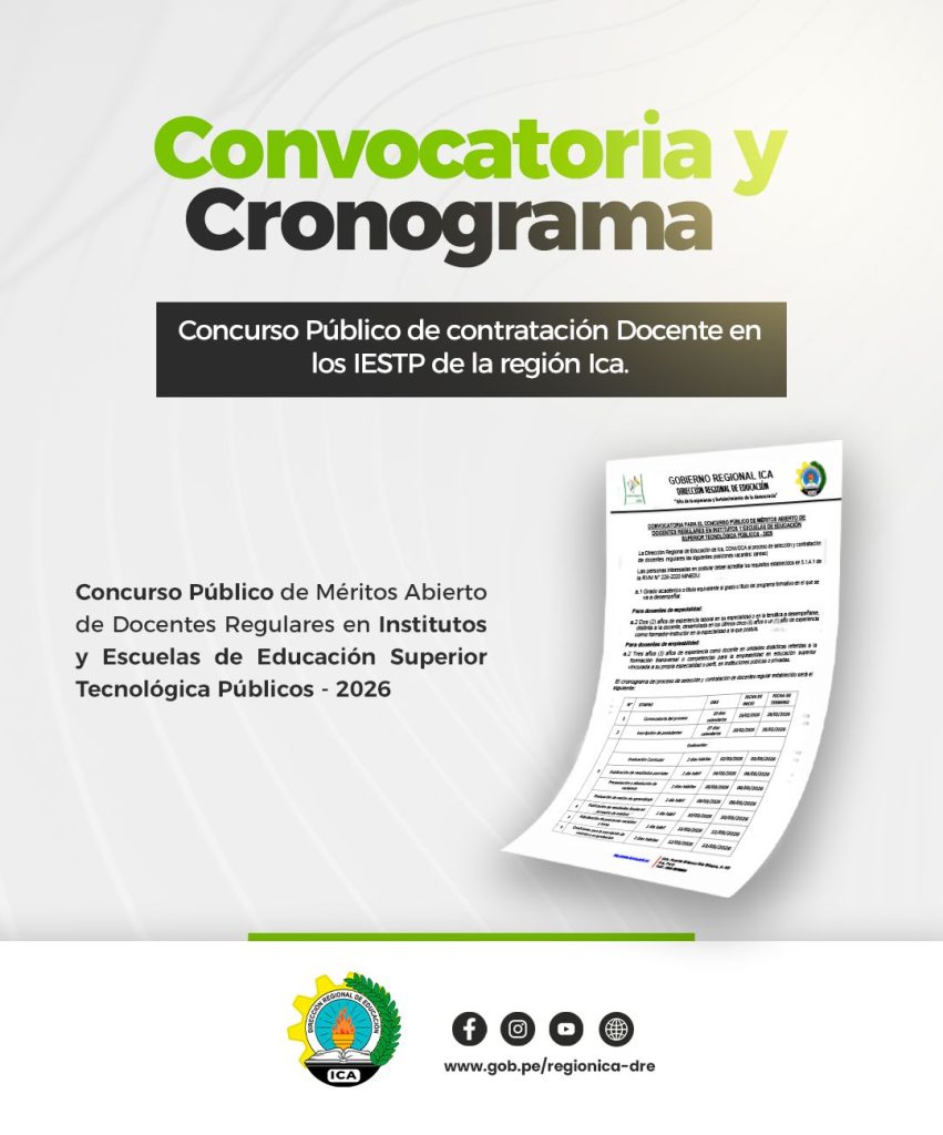 Convocatoria y cronograma del concurso público de contratación docente 2026 en los IESTP de la región Ica.